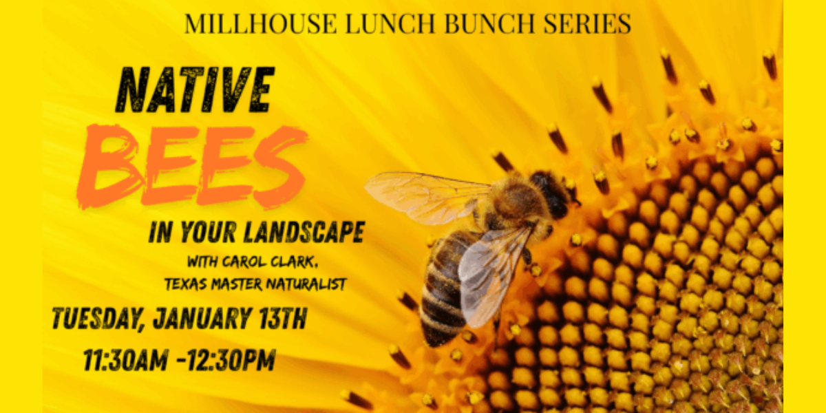 Join MillHouse McKinney’s Lunch Bunch Speaker Series for an informal, educational conversation about native bees in Texas. Learn how to identify these essential pollinators, create backyard habitats, and participate in citizen science programs. Bring your own lunch—everyone is welcome, and the event is free